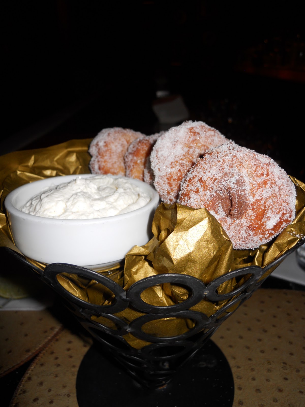 Doughnuts: Anything Nutella I have to try and these Warm doughnuts sung out to me. We received them in a metal basket with golden tissue paper and the doughnuts set on top. The menu did not specify they were made with a ricotta dough, making them a bit heavier then I prefer my doughnuts and they flavored it with an essence I could not place my finger on. I thought and thought because it was a known flavor (and one I don’t appreciate it much) but after going back and forth with M. I realized what it was: ALMOND EXTRACT! Finally! And this is my issue with it: when overly used, it’s a horrible flavor to my palate. It even overshadowed the NUTELLA! Can you believe that?! So, not my best recommendation for dessert but a good concept either way. Oh, it was served with a flavored whipped cream but I don’t remember the flavoring in it.