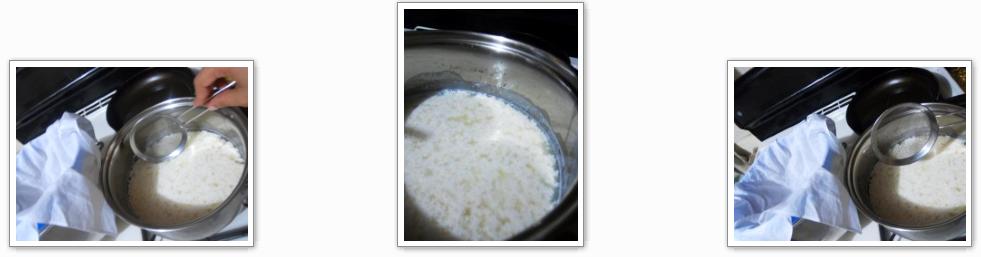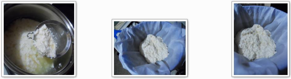 Equipment: large pot, wooden spoon, big and small colanders, cheese cloth (or new handkerchief), large bowl, thermometer (optional)
