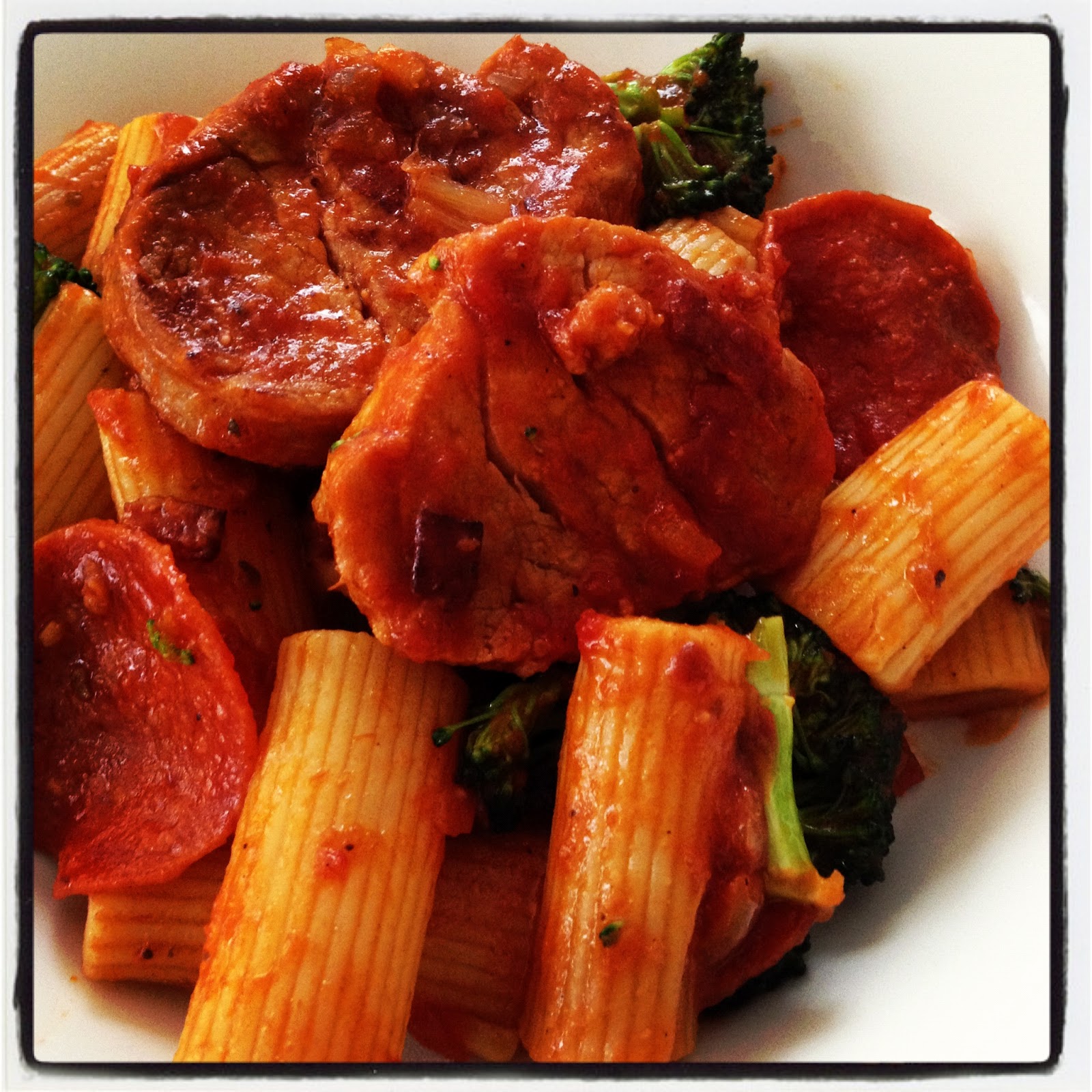 - Sear pork on both sides and continue cooking peppers. Add pepperoni slices.