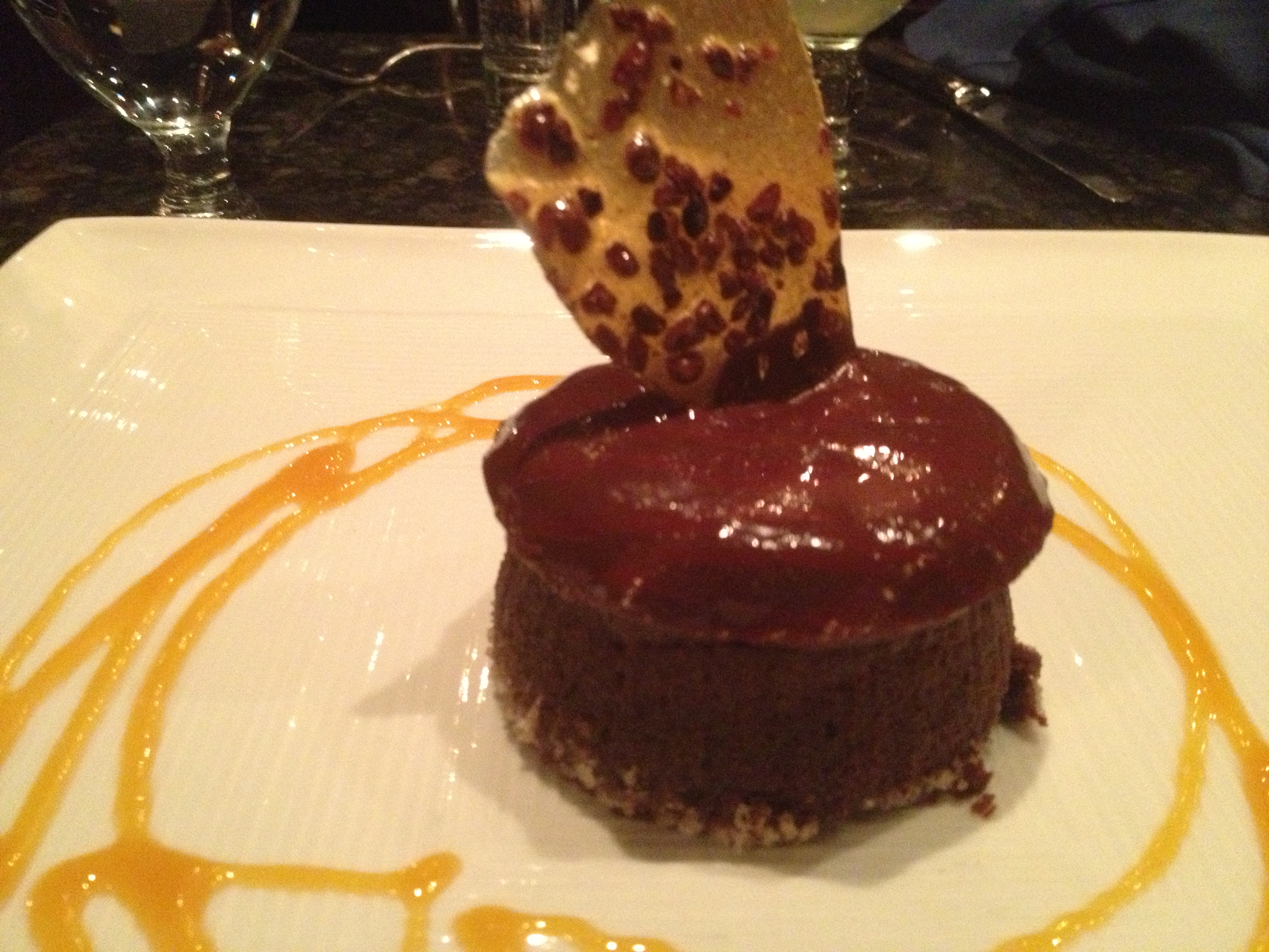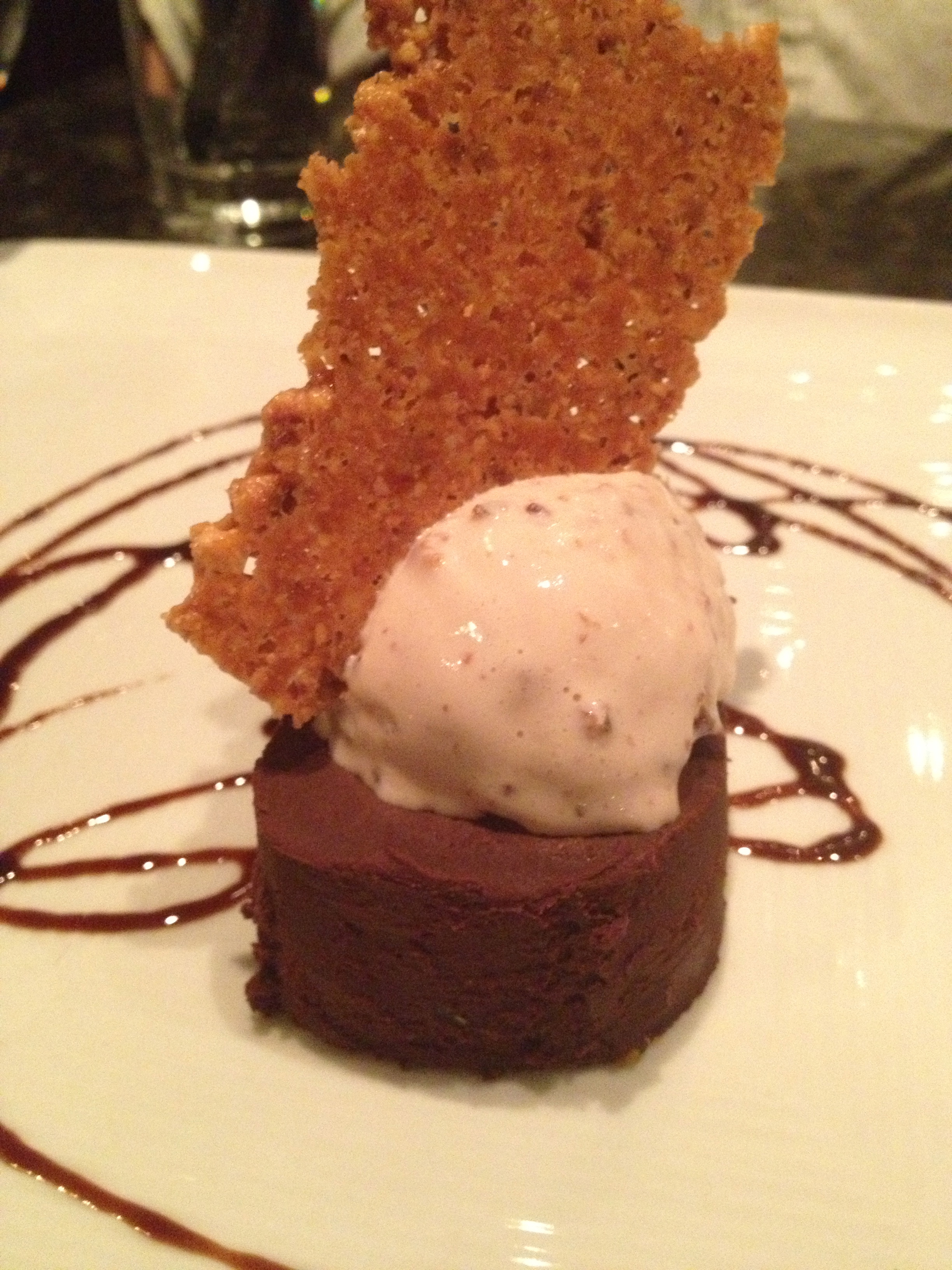 Chocolate Torte with Mission Fig Ice Cream, Hazelnut Crunch, and Balsamic Syrup – best combination ever! The torte was dense and moist, lending a slight chocolate bitterness to the sweet, creamy ice cream. You’d swipe your spoon across the plate to grab some of the balsamic syrup and your tongue tingled in delight!