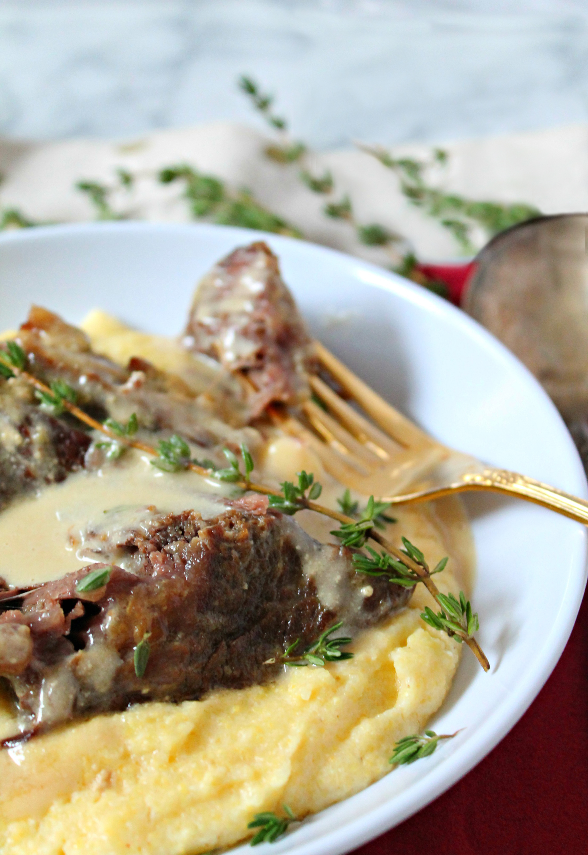 - Serve polenta topped with short ribs and sauce. Top with fresh thyme and enjoy!
